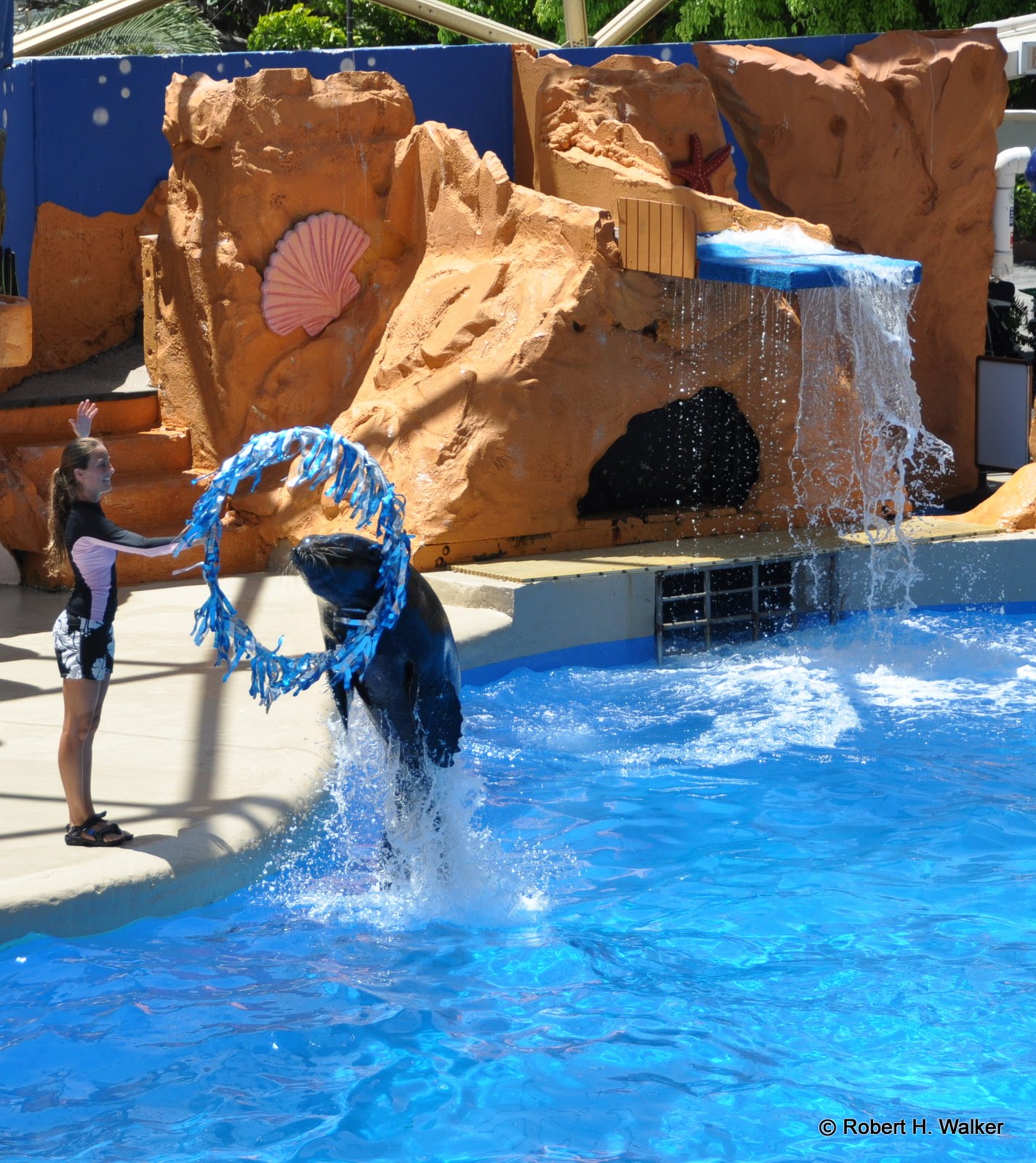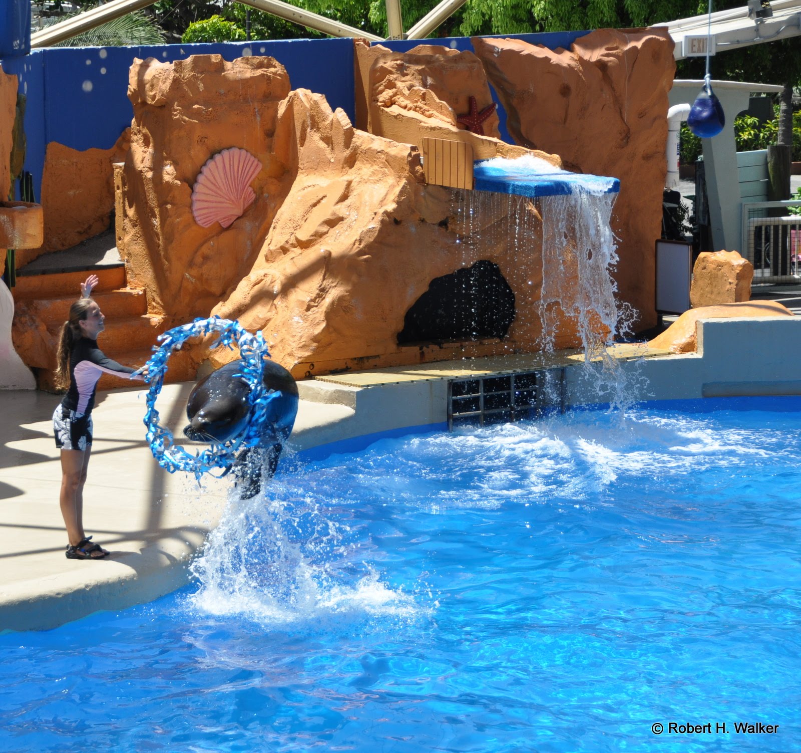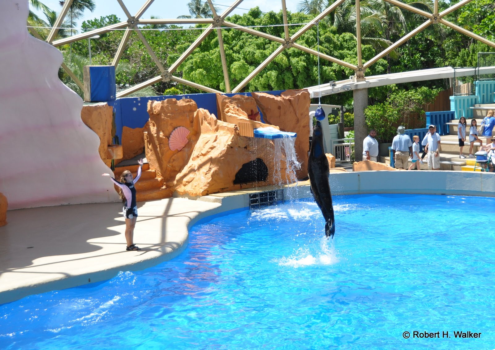 I went to the Miami Seaquarium on Tuesday - June 22, 2010 and took these images with my Nikon D-90 and the 18-200 mm lens. I shot in sports mode with wide bracket focus and hi-speed shooting at 4.5 images per second. I must admit the d90 of Nikon is really a first class digital camera. This is my back up camera as I did not want to take my d-300 to Miami. I was at the top level in the back row and I zoomed in and did some minor cropping only - no photoshop as these are not retouched. I do not remember if these are the seals or seal lions. Sea lions are very large creatures, unlike seals that are about the size of a medium build dog.